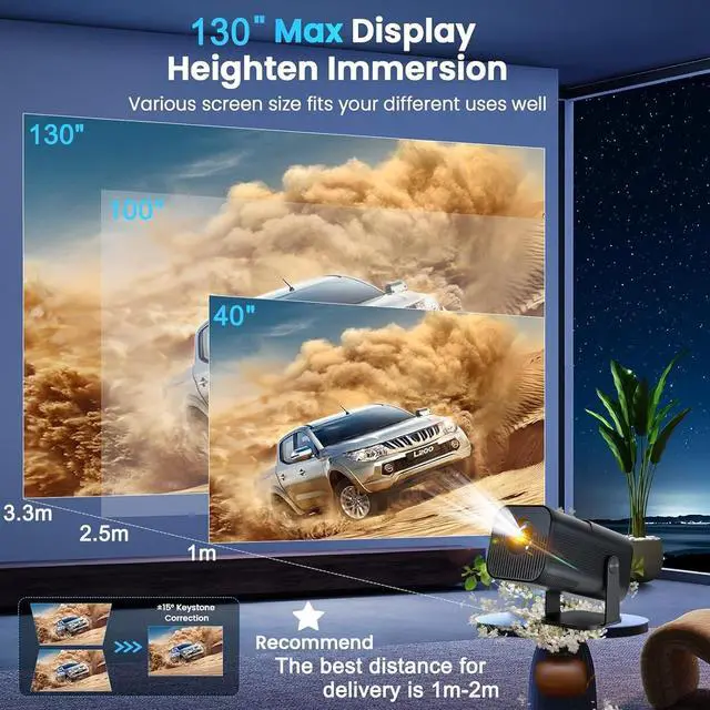 Native 1080P resolution with a peak brightness of up to 300 ppm. A combined 800:1 static contrast ratio and 10000:1 dynamic contrast ratio effectively reduce eye strain, bringing your favorite movies, TV shows, and games to life, even on a 130-inch screen. Seamlessly stream Netflix, YouTube, or Roku for a true cinematic experience at home or outdoors.