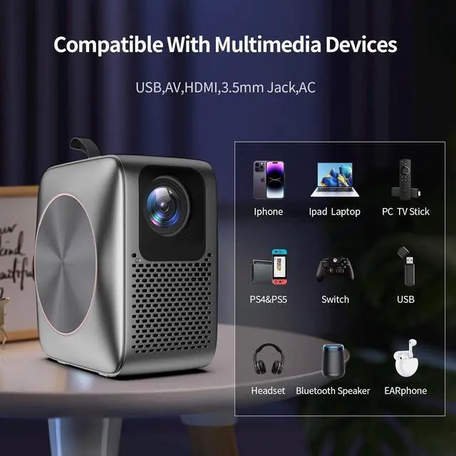 Projector with Bluetooth, Better Sound & Lower Noise-It is a Bluetooth Projector. You can wirelessly pair with your bluetooth speaker, headphones, soundbar anytime and anywhere. It is a mini projector with WiFi and bluetooth, you can hook up external speakers, the sound is greatly enhanced and sounded theater quality. Also, the built-in stereo surround speaker is good enough to enjoy the pleasure sounds in different scenes, if you don't want to add another speaker.
