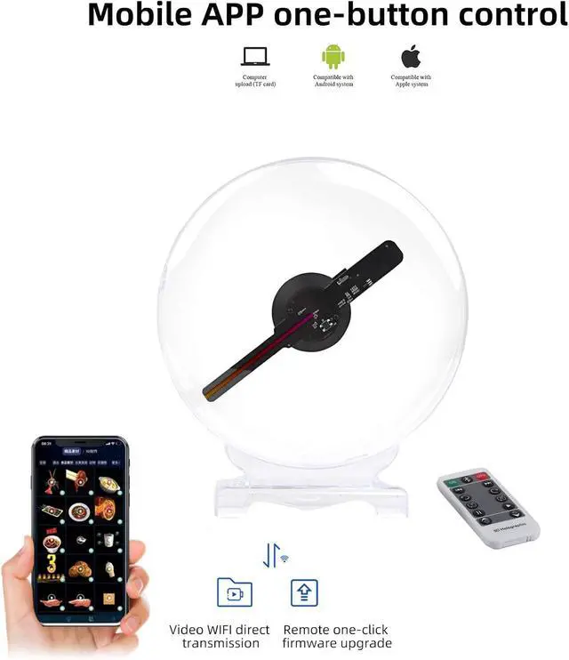 The Missyou 3dHologramFan Projector Stands Out With Its User-Friendly App, Offering Easy Content Change On Your Hologram Fan Display Via Wifi Connectivity. Compatible With Both Android And Ios, This 3d Wifi Hologram Display Led Fan Wifi Provides A Seamless Experience Of Switching Your Video Materials. Additionally, Remote Control Is Included For Simple Power On-Off And Video Sequence Control, Making This Holographic Advertising Display A Breeze To Use.