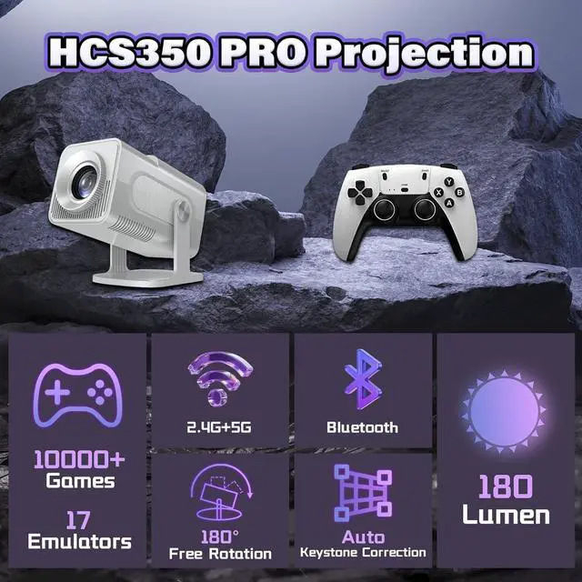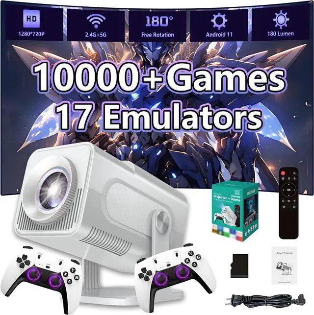 This home projector requires zero complicated setupjust unbox, plug in, and play. Whether placed on a living room table, bedroom stand, or camping ground, its 180° flexible projection design supports any angle onto walls, ceilings, or side surfaces, eliminating placement hassles. Auto keystone correction activates instantly upon startup, delivering perfectly aligned, crisp images. The Android 11 interface offers a clean, intuitive experience. 1280*720P HD resolution reveals intricate game character textures and cinematic details. With 180 lumens brightness, content remains visible even during daytime with sheer curtains drawn. Colors appear true and natural, while nighttime brightness is soft and non-glare, preventing eye strain during extended movie or gaming sessions. Connect to dual-band 2.4G/5G WiFi to play over 10,000 pre-installed games. The 5G band delivers zero-latency performance for competitive gaming with rapid button response, while the 2.4G band ensures stable wall penetrationeffortlessly mirror your bedroom phone screen. Pair with two ergonomic wireless controllers designed to fit your palms perfectly, preventing fatigue during extended use. Precise buttons ensure zero input lag, elevating multiplayer battles with friends to next-level excitement. Connect Bluetooth speakers for immersive surround sound. Whether lounging on the couch watching movies or sitting on the rug gaming, unlock cinema-quality big-screen enjoymenttransform any small space into your personal entertainment hub