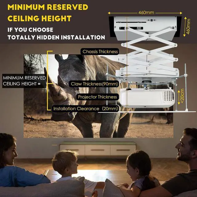 Adjustable Running Distance, Easy To UseYou can adjust projector ceiling mount to any height you want with remote control. With memory function, it will automatically reach the set distance. All necessary hardware, clear instructions and videos are provided for assembly and use. TIPS: Manual mechanical adjustment to screws on the chassis is required before changing the upper and lower limits again.