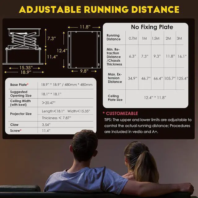 Suitable For Various ProjectorsOur motorized projector mount is suitable for many types of projectors. Projector Length18.1", Width15.3", Thickness7.8". 18.9*18.9" Base plate and screw can be CUSTOMIZED to fit your projector and ceiling size, so before ordering, you may tell us the size and weight of your projector.