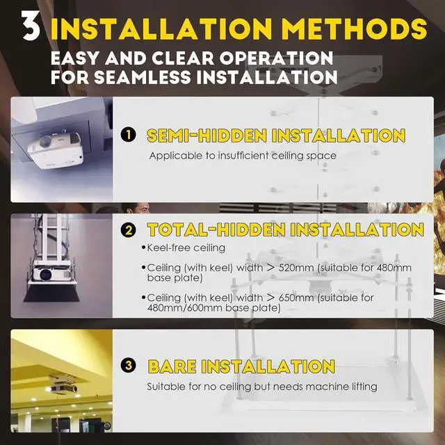 Ultra-thin Hidden Embedded 3 mounting methods available, helping you to achieve seamless install and fully hidden installation. MIN Reserved Ceiling Height"276mm/10.9" + your projector thickness". Occupy no space, tiny and elegant, perfect for conference rooms, home theater systems, offices, stage, classrooms and other places.
