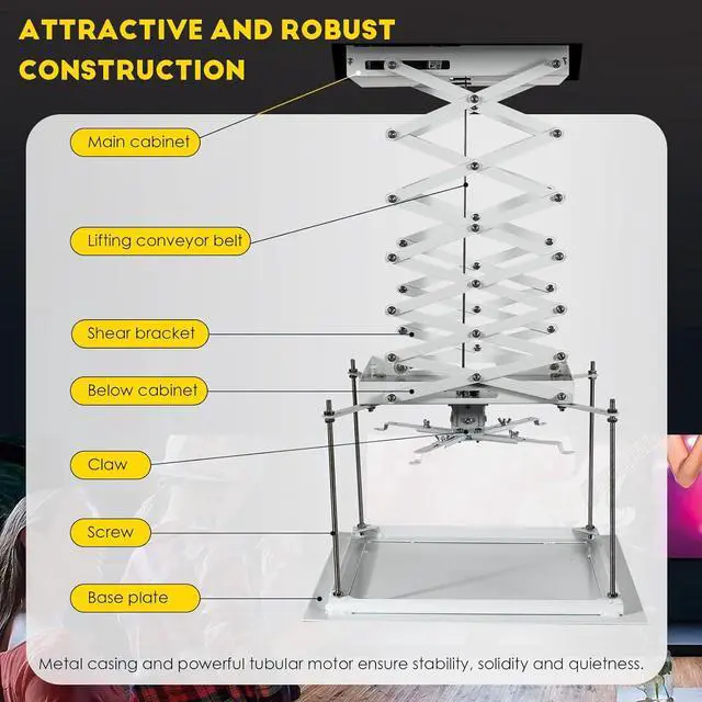 44lbs Large CapacityThe upgraded powerful tubular motor can carry up to 44lbs/20kg, making it ideal for large and heavy projectors. Deceleration electromagnetic brake design and all metal construction ensure stable, smooth and quite operation.
