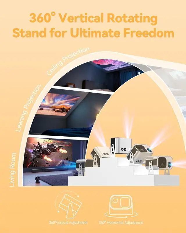 360° Rotatable Stand & Full ConnectivityThe 360° stand lets this movie projector display on walls, ceilings, or outdoors effortlessly. With HDMI, USB-C, USB, and AV, it connects to Fire Stick, PS5, and more. Perfect for movies, parties, and presentations.