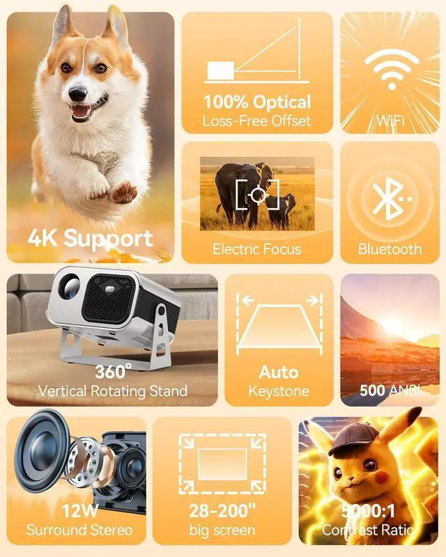 Wi-Fi 6 & Bluetooth 5.2: Dual Wireless FreedomEnjoy seamless streaming on this projector with WiFi and Bluetooth. Wi-Fi 6 enables smooth mirroring from iOS/Android devices. Connect Bluetooth speakers or headphones. The built-in 12W surround sound delivers rich Dolby Audio for a cable-free movie projector experience.