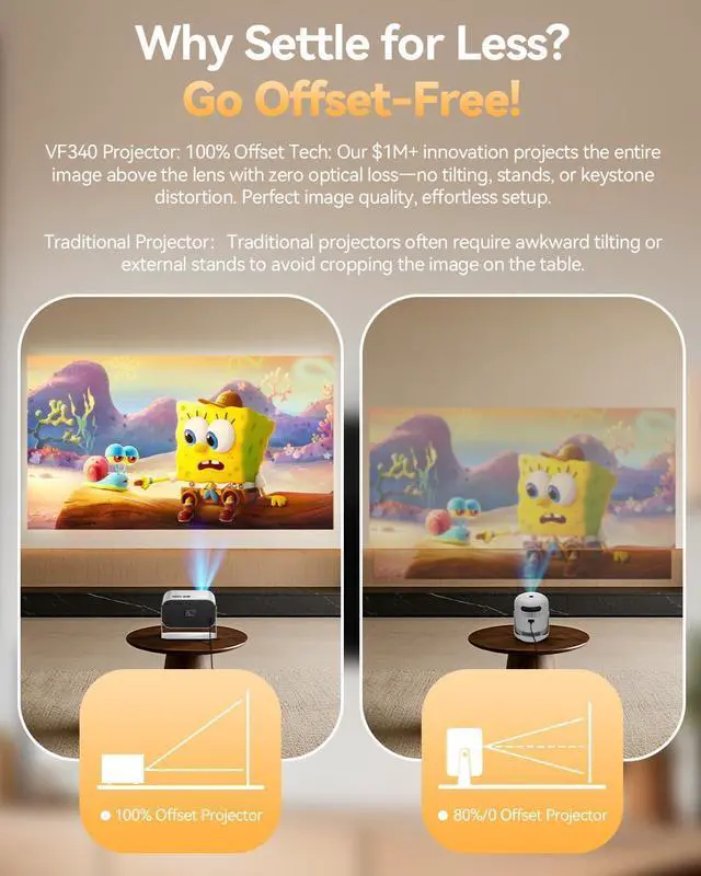 100% Offset Technology: Total Placement FreedomNo more blocked views! This projector with WiFi and Bluetooth uses 100% Offset Technology to project a perfect image from below the screen. Place the movie projector on a table, shelf, or floor without skewed pictures. Eliminates shadows and tripod clutter. Perfect where traditional projectors dont fit.