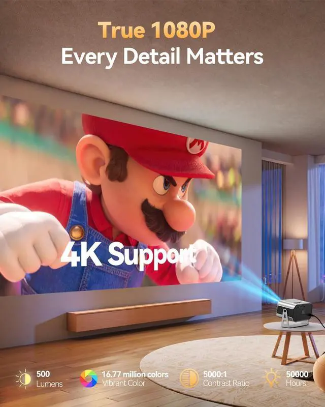 True 1080P HD & 4K Support with 600 ANSIExperience native clarity with this 1080P projector, featuring vibrant Projector 4K support. 600 ANSI lumens deliver a bright, sharp image in dim light. Ideal for movies, gaming, and presentations, this movie projector brings content to life day or night.