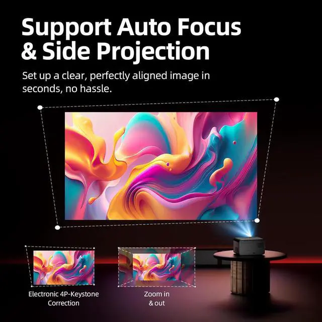 Auto Focus & Keystone Correction for Instant Clarity No more manual adjustments! The auto focus & keystone correction ensures a perfectly aligned and sharp image in seconds, even when placed at an angle. Great for young professionals and renters who need quick, hassle-free setup.