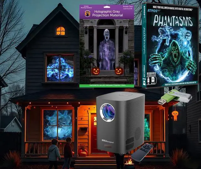 HoliScapes USB Projector Kit - AtmosFx Phantasms on USB + Projector + 5 ft x 9 ft Large Gray Holographic Screen The USB Stick features 5 different Halloween videos Demonic Poltergeist The USB Stick features 5 different Halloween videos Wicked Wraith Holiscapes HD LED Projector with Sound and Remote Holiscapes HD LED Projector with Sound and Remote Qty 1 5.5 ft x 9 ft Large Gray Reaper Brothers Translucent Fabric Screen 5.5 ft x 9 ft Screen Many ways to Display your Phantasms Halloween digital decoration Display in your window