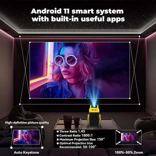 Kid-Friendly + Portable for Any AdventureXBJ portable projector. Lightweight and durable, take it camping, to dorm rooms, or on road trips. The Android 11 system lets kids stream educational apps, and the auto-keystone correction for effortless projection. Its compact size fits in backpacks, making it ideal for on-the-go fun.