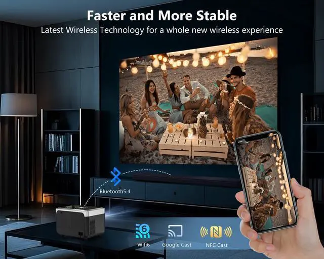 [ NFC Cast & Google cast Built-In ] Smart projector boasts an innovative NFC Screen cast function, by simply tapping your NFC-enabled phone to the remote, you can effortlessly cast movies to your screen. Built-in Google cast with WiFi 6 connectivity, youll enjoy ultra-fast streaming and seamless performance, without compromising on clarity.