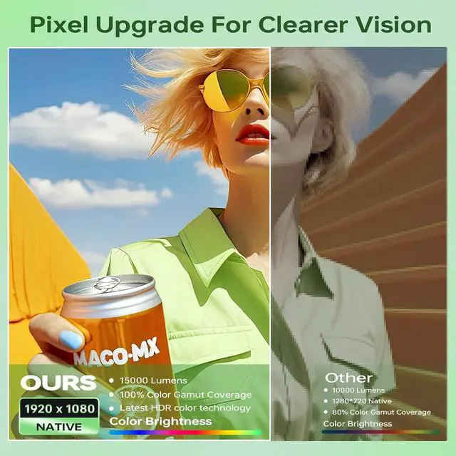 Native 1080p Rich Color: The vision beam projector with wifi and bluetooth has a high-definition resolution of 1920 x 1080p, and every detail in the image can present a realistic biological appearance. The high brightness of 15000 lumens ensures bright and vibrant colors. By combining the latest HDR color technology with advanced image edge processing algorithms, the contrast and color saturation of the image have been greatly improved, ensuring clear and sharp image edges.