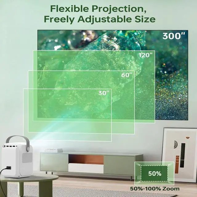 Perfect Screen and Zoom Function: In terms of adjusting the screen size, short throw projector supports a projection screen size of 41-300 inches, with a wide adjustment range and a 100% -50% scaling ability. The function is practical, and you can easily adjust the screen size without changing the projection distance. You can adjust the screen to the ideal size that best suits your viewing experience based on the actual viewing scene and personal preferences, thereby achieving perfect image projection and providing you with the best viewing experience.