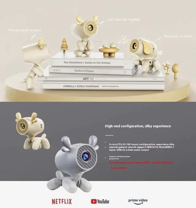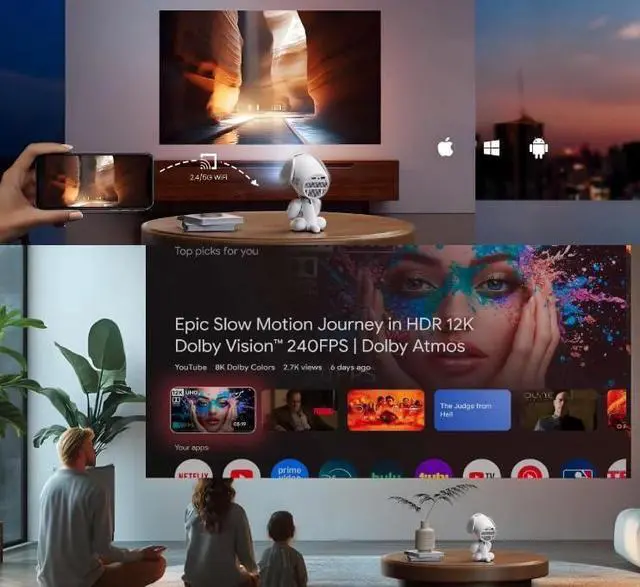 Smart Projector with Android 13 & WiFi6This mini projector built-in Android 11 operating system, with a rich built-in app ecosystem that gives you easy access to mainstream streaming services such as Netflix, Prime Video, YouTube and more, sitting on a massive content library of over 500,000 movies and TV shows. and it's uses the latest WiFi6 technology, higher transmission rate and lower latency than 5G, a few seconds will be wirelessly synchronized to get a big screen.