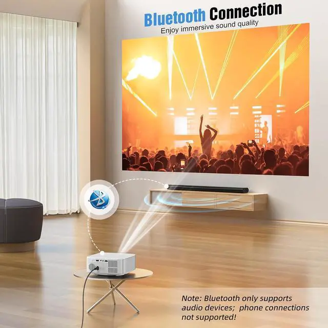 [Latest Two-Way Bluetooth Projector]It supports two-way Bluetooth audio transmission. It can be used as a standalone speaker with mobile devices or paired with external bluetooth speakers/headsets to enhance the audio quality of the home projector, anytime, anywhere. Note: Bluetooth only supports audio devices; phone connection is not supported.