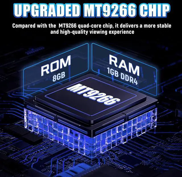 Powerful Quad-Core Chip Performance: This smart projector with wifi and bluetooth features the high-performance MT9266 core chip, ensuring smooth, lag-free multitasking across projection, audio, and system operations. Equipped with 1GB DDR4 RAM, it significantly boosts data read/write speeds, enabling seamless transitions between projected images and built-in apps without lag for a smooth user experience. The built-in 8GB ROM provides generous space to store a vast array of apps, high-definition images and short videos, eliminating the need for frequent cache clearing