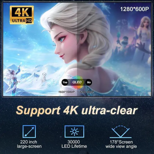 [The noise-reducing cooling system] benefits from advanced fan cooling technology, making this portable projector quieter and more durable. The powerful cooling system effectively dissipates the heat from the bulb, extending its lifespan to 85,000 hours, which means you can use it for over 30 years. Classical and modern, quiet and joyful coexist.