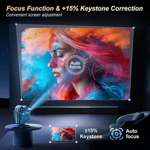 WIFI 6 Connectivity and Auto FocusThe BESUS retro projector was crafted over two years by a team of 12 engineers and is equipped with enhanced WiFi capabilities and automatic keystone correction for images. After the upgrade, it supports WiFi 6 and Bluetooth 5.1 for fast and stable connectivity. You can also wirelessly connect external Bluetooth speakers and headphones for a more immersive audio experience at parties or any outdoor activities.