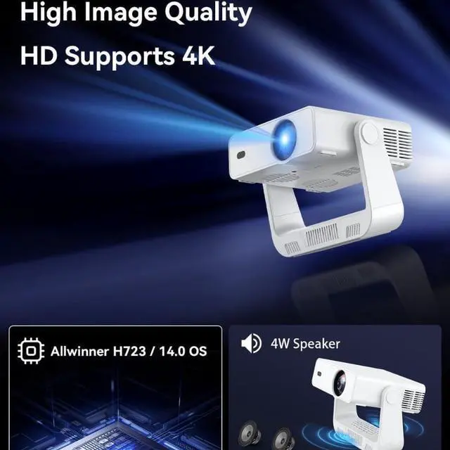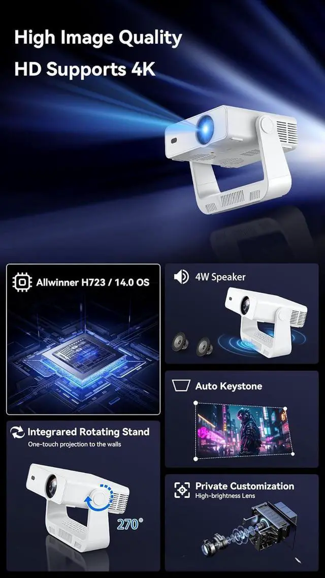 INTEGRATED ROTATING STAND: Built-in 270-degree rotating stand enables one-touch projection to walls or ceilings, providing flexible viewing angles without additional mounting equipment