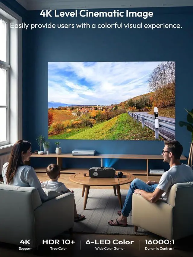 [Incredible 4K Detail & Rich Colors] Featuring 4K UHD decoding with HDR10+, HLG compatibility, a 23000:1 dynamic contrast ratio, and a superior 6-color LED light source, this ultra HD projector delivers sharper, life-like images for your IMAX-quality experience.