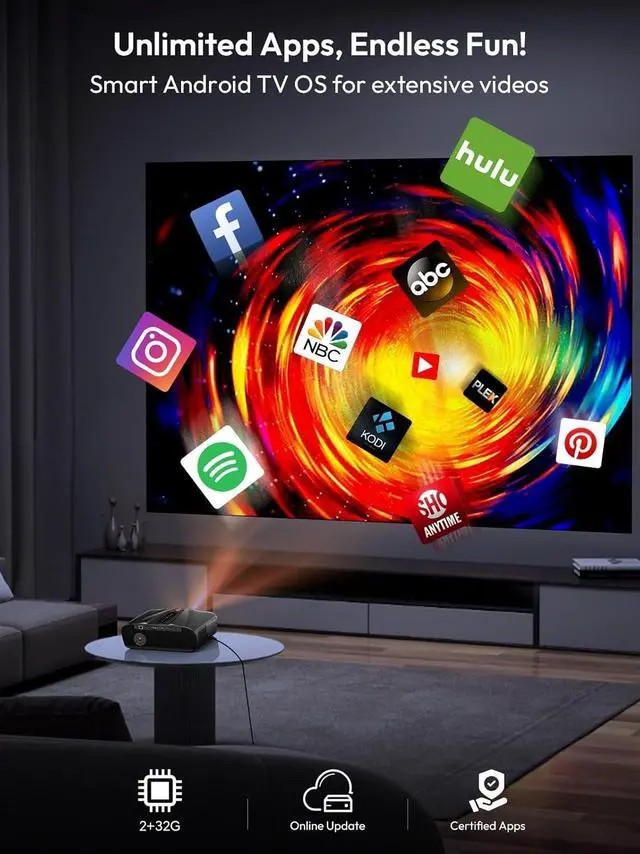 [Endless Entertainment with Android TV] Stream 100,000+ apps freely, and enjoy seamless access to your favorite content with your smart projector. Large 2GB RAM/ 32GB storage, 2.4G/5G bands/WiFi 6, with a single-stream bandwidth of up to 1200Mbps and a maximum rate of 9.6Gbps, no lag.