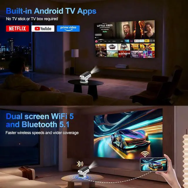 Ultra-Fast Dual-Band 5G WiFi & BT 5.1: This small projector features 2.4G and 5G WiFi for stable, low-latency streaming and screen mirroring. Bluetooth 5.1 seamlessly connects to external speakers for an immersive sports viewing experience