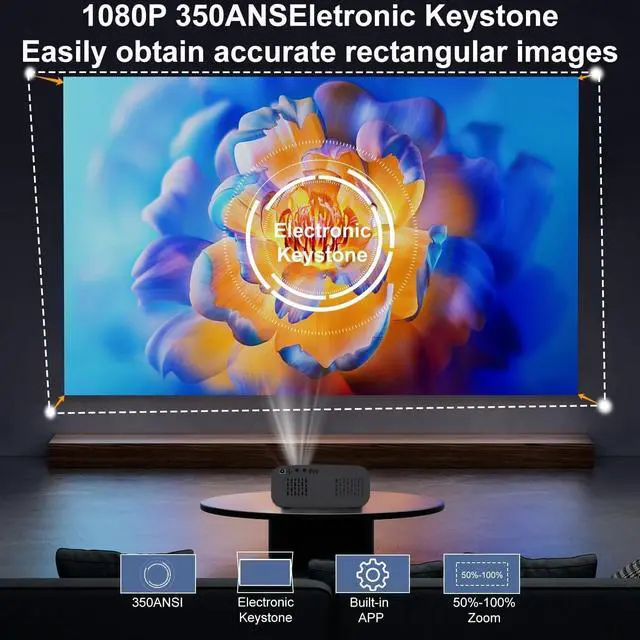[Electric Keystone Correction]: The Projector is equipped with Electric Keystone Correction to easily optimize image alignment and ensure the perfect visual effect every time. With the Electric focus function, you can quickly get clear images at any time and experience sharp, clear visual effects.