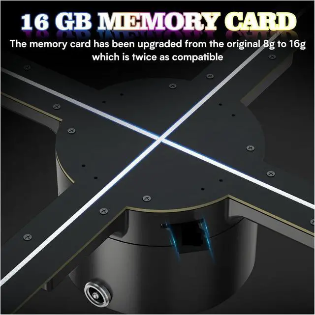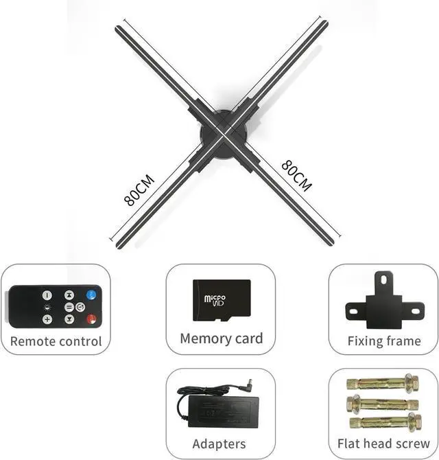 Complete set of products Package includes 1* 3D fan holographic projector 1* Adapter and charger 1* Remote control (if any) 1* Frame with screws 1* User manual 1* TF card