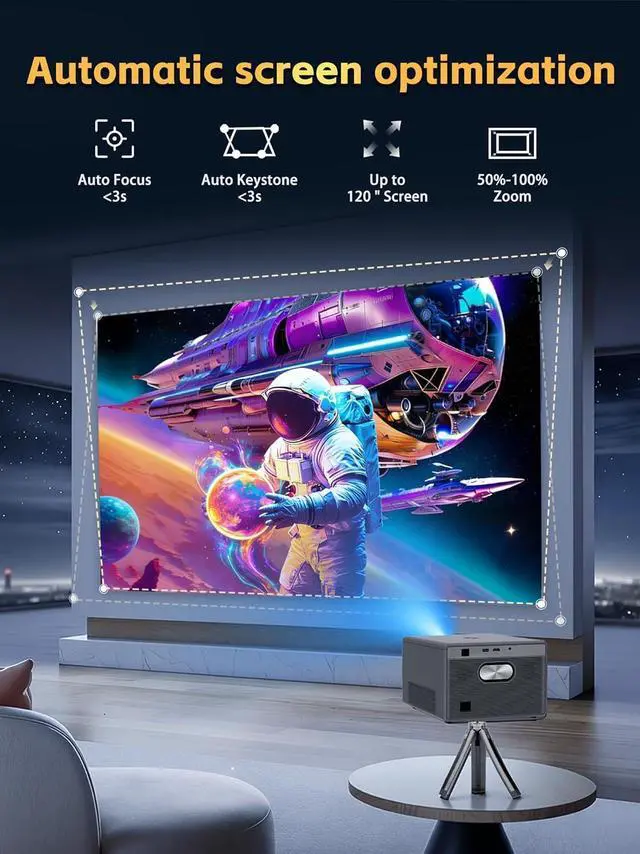 Auto Focus & Auto KeystoneHome Theater Video Projector, with Get a HD picture in seconds, not minutes. Our intelligent video projector Auto Focus and Auto Keystone Correction technology instantly delivers a crisply sharp and perfectly rectangular image from almost any angle or surface. Simply turn it on and its ready to gono tedious manual adjustments required.