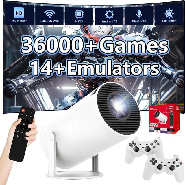 This home projector requires no complicated setupit's ready to use right out of the box. Auto keystone correction ensures perfectly square images without manual adjustments. Boot into the clean Android 11 interface in 3 secondseven seniors and kids can navigate icons in 30 seconds. Play 36,000+ classic games directly, or connect to TV boxes/phones via HD cable for seamless toggling between movie/office modes. 1024*600P HD resolution reveals intricate game textures and cinematic details. 130-lumen brightness remains visible even with sheer curtains during daytime, while nighttime settings offer soft, non-glare illumination. Paired with two ergonomic wireless controllers, they feature comfortable, non-slip grips and zero-latency button response for exhilarating multiplayer battles