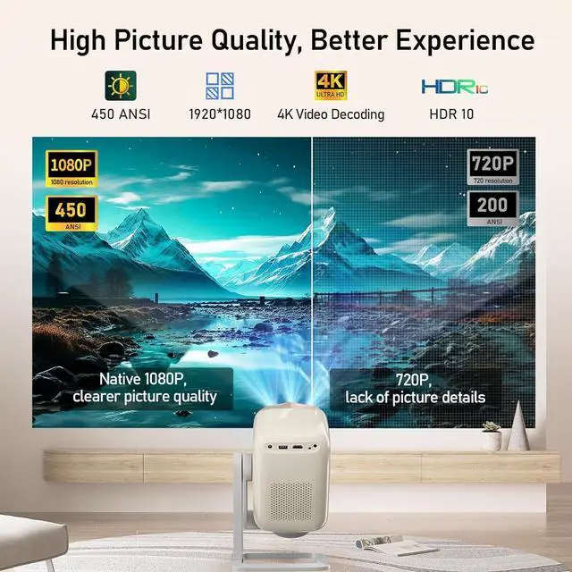 3. Immersive High-Definition Visuals & Audio Enjoy a vivid 100-inch cinematic experience with bright 450 ANSI lumens, native 1080P Full HD resolution, and advanced 4K decoding. Every detail comes to life with rich, true-to-life colors. Dual built-in 3W speakers deliver clear, immersive sound. Setup is effortless thanks to automatic keystone correction and auto focus, ensuring a perfectly aligned, sharp image every timeideal for users of all levels.