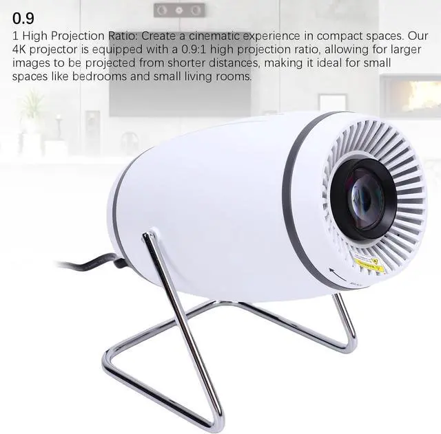 0.9:1 High Projection Ratio: Create a cinematic experience in compact spaces. Our 4K projector is equipped with a 0.9:1 high projection ratio, allowing for larger images to be projected from shorter distances, making it ideal for small spaces like bedrooms and small living rooms.