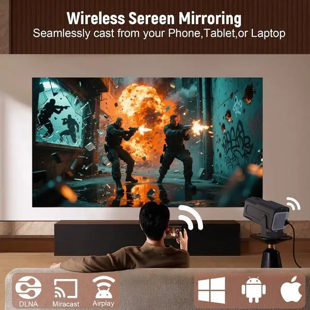 Dual-Band WiFi 6 & Bluetooth 5.2Experience zero-buffering 4K streaming with next-gen mini projector with wifi and bluetooth technology! Dual-band WiFi 6 (2.4GHz + 5GHz) is 3x faster than older WiFi 5.2. It allows for buffer-free, lag-free movies and gaming, while Bluetooth 5.2 allows for instant pairing with speakers or headphones. Mirror iOS/Android devices or connect laptops wirelesslyportable movie projector freedom without cables. Stream, share, and play effortlessly from any corner of your home or backyard.