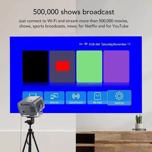 For Android TV 11.0: Equipped with for Android TV 11.0, the smart projector connects to WiFi and offers access to over 500,000 movies, shows, sports broadcasts, news, for Netflix, and for . With a 360° rotatable stand, it simplifies installation and achieves the best projection in any scene.