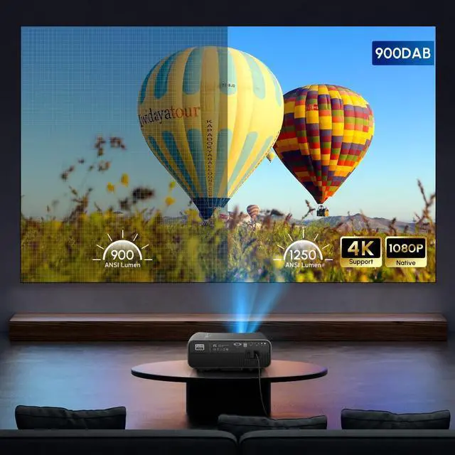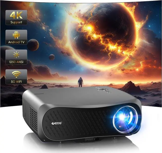 Ultra Bright Outdoor/Home Projector-2024 UpgradedHere is the 4K projector with an upgrade in overall performance - from brightness to contrast to android system to give you the upgraded experience. Higher brightness 1250 ANSI lumens, 1080p native with 4k decoding, 16000:1 high contrast, 93% DCI-P3 wide color gamut, HDR10+, delivers accurate colors, clear text and deeper blacks in a well-lit environment, perfect for movies, games, small presentations, daytime Indoor use.