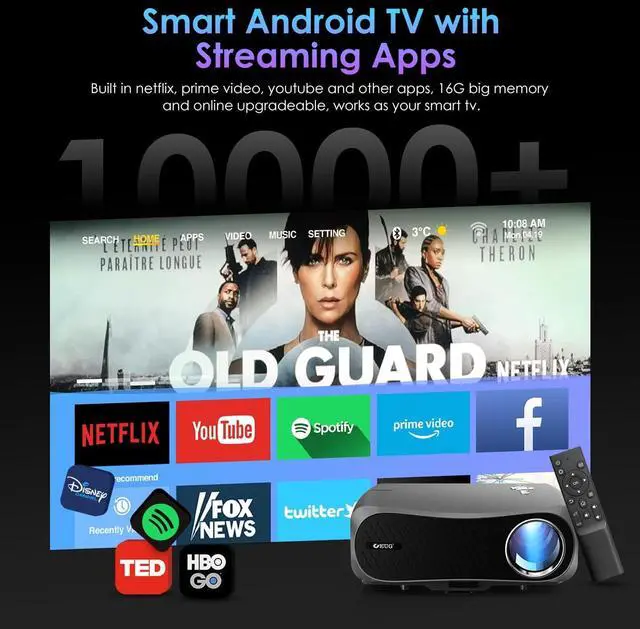 Super smooth Android TV & 2.4G/5G WiFi Powered by Android TV OS (2G+16G), this smart projector 4K offers you a variety of apps and access to endless online entertainment. Push your favorite content in real time, directly enjoy past content through browsing history.The outdoor 4K projector enables faster and more stable wireless connection with your smartphone, PC, laptop and tablet, providing smooth video streaming and online gaming experience.
