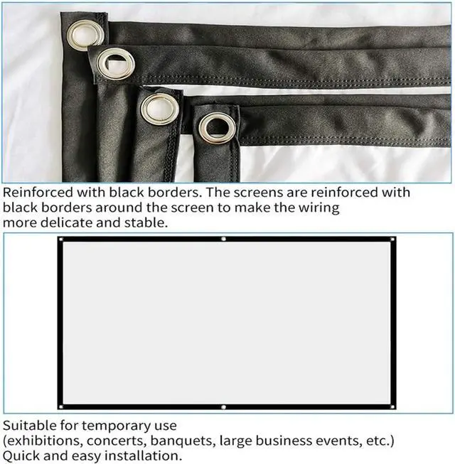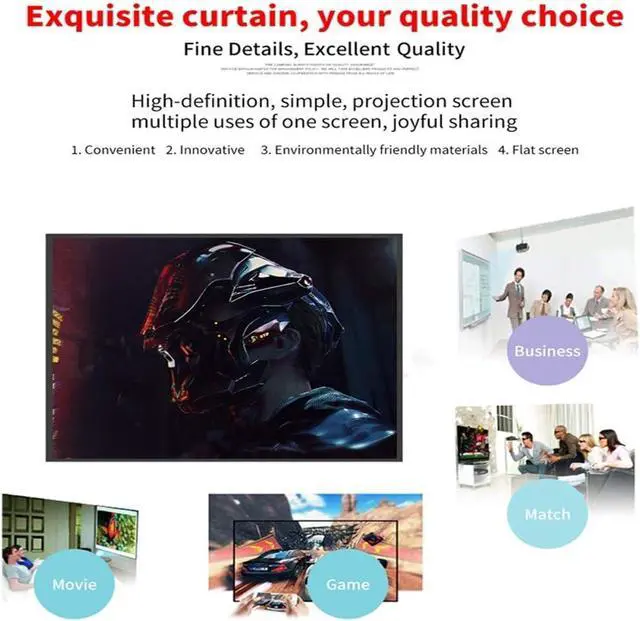 1. Never miss our projector screen, it will be your projector's best friend and start a new way of entertainment. 60/72/84/100/120/150-inch high-definition 16:9 excellent movie screen, made of natural polyester fiber.