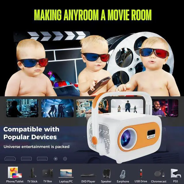 Multi-device Connection & Reliable After-SalesEquipped with HDMI, USB, and a 3.5mm headphone jack, this home theater projector works seamlessly with Fire TV Stick, Chromecast, Roku, laptops, USB drives, external speakers, iPhones, Android devices, and PS5. Perfect for garden parties, family movie nights, and more, tv projector is your versatile entertainment solution.
