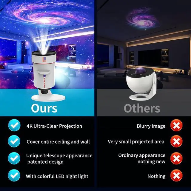 2025 Newest 8th Gen Planetarium Projector-- Features a unique telescope-inspired design adding a futuristic touch to home decor. This galaxy projector for bedroom comes with 10 replaceable film discs: Solar System, Earth, Moon, Saturn, Pillars of Creation, Virgo Supercluster, Wormhole, Spiral Galaxy-1, Spiral Galaxy-2, Marine Organism