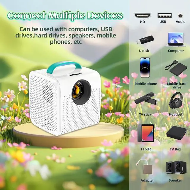 Multi-device Connectivity for Limitless FunThe mini portable projector is designed with versatile connectivity options. It can be easily linked to a wide range of devices, including computers, USB drives, hard disks, speakers, and mobile phones. Whether your child wants to watch educational videos from a USB, stream their favorite cartoons from a phone, or play games on a big screen with audio from speakers, this small projector makes it all possible. Enjoy seamless entertainment and learning experiences with various devices