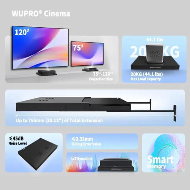 Adopting high quality aluminium alloy, the load bearing capacity is up to 20kg(44bl), which ensures that the UST projector is stable enough on the slider, and 30dm ultra-low decibel This provides better quiet operation and stable output experience.