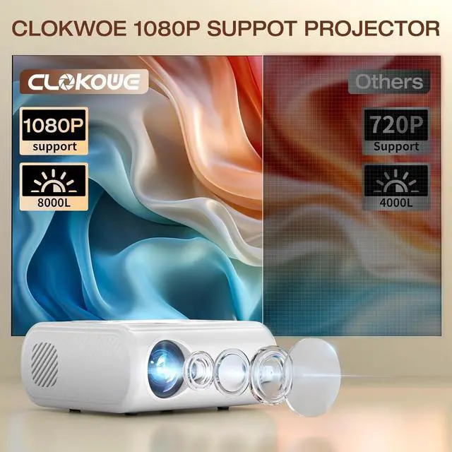 2025 Enhanced Mini Projector This mini projector boasts an impressive 9000 Lux brightness and supports a 1080P Full HD display spanning from 30 to 180 inches (optimal for 60 to 100 inches). It incorporates advanced LED technology and a uniform illumination method, ensuring vivid and clear projections with bright and defined edges. These features combine to deliver a truly immersive viewing experience with dynamic colors. Moreover, the mini projector integrates diffuse reflection technology to prevent eye fatigue.