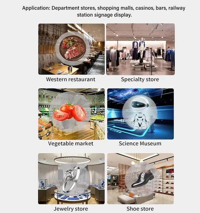 WIDE APPLICATION: 3D holographic projector is widely used in department stores, shopping malls, casinos, bars, railway station sign display, restaurants, city traffic, schools, businesses, event venues, stages, exhibition halls and so on.