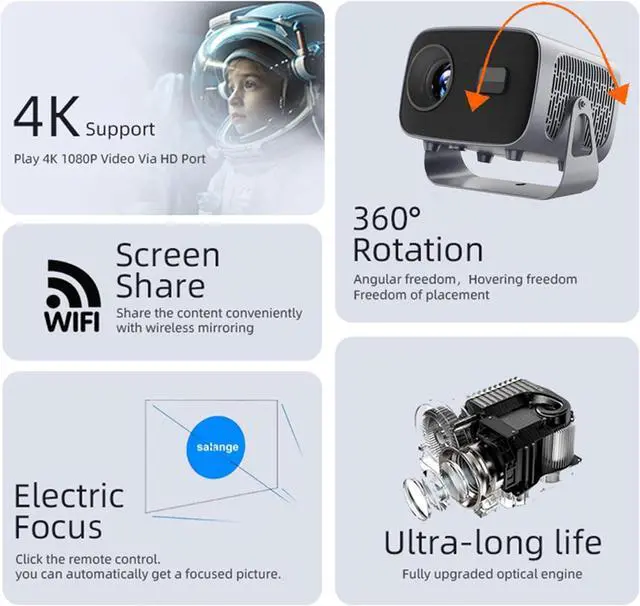 360° Flexible Projection & Auto FocusThe 360° rotatable function of this small projector allows you to adjust the projection angle at will. Whether you are in the living room, bedroom, or conference room, you can flexibly adjust the projector angle and height for a full - range projection experience. Coupled with the Auto Focus technology, a clear picture can be presented instantly when the movie projector is turned on. There is no need for manual adjustment, getting rid of the trouble of blurred images and bringing you a convenient and efficient projection enjoyment