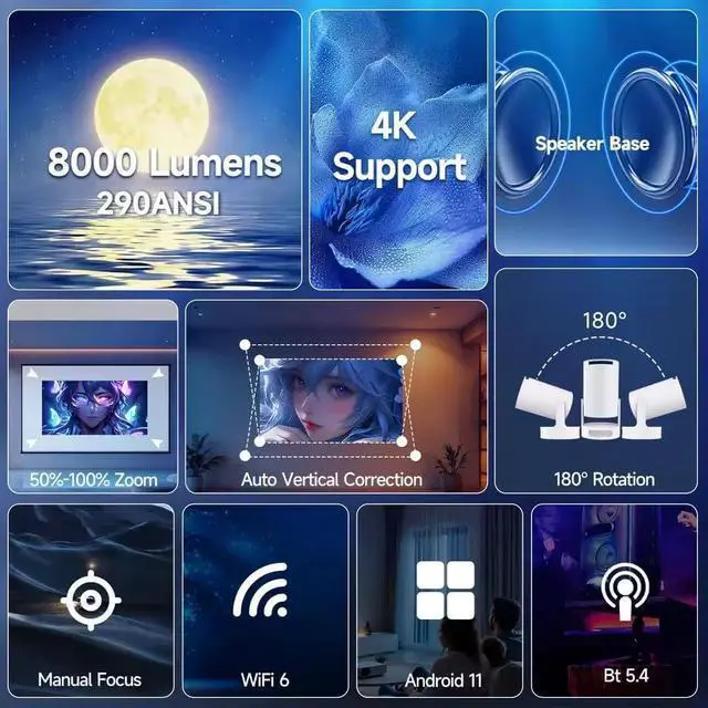4k/1080p Home Theater Experience: Supports 4k/1080P video playback, native 1280x720P resolution and 150ANSI lumens present clear and shocking visual experience