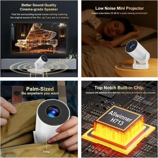 Smart Projector: Mini projector with automatic keystone correction and manual focus technology, built-in high-precision sensors, 50% zoom function and less than 25 dB of noise ensures an impressive soundstage