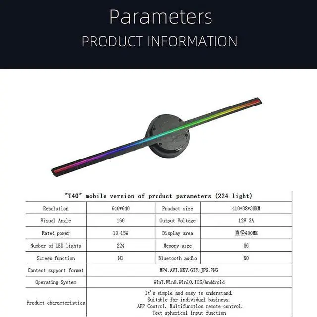 Cool, three-dimensional, holographic, enhance attention, enhance visual impact.WIFI transfers content, which can be remotely manipulated to replace content and upgrade.