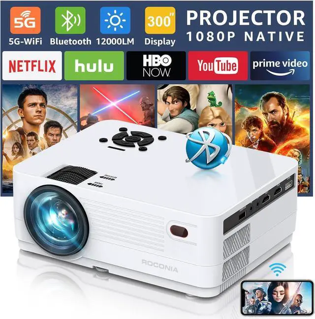 5G WiFi Bluetooth portable projector uses a newly upgraded low-consumption LED light source, high-quality materials, and exquisite manufacturing technology. It supports 4K, native 1920*1080P resolution, 12000 lumens brightness, and 10000:1 contrast ratio. The 300 large screen provides stunning projection images. Not only the 4K video projector protects your eyes, but the picture quality is also clearer and more delicate. It provides you with a movie-watching experience.