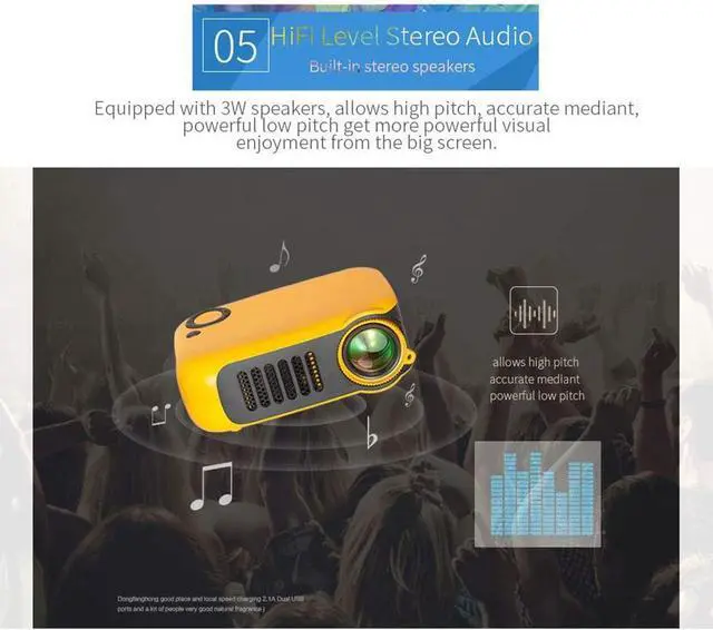 Portable and Lightweight:The mini projector is lightweight and compace in size. Smaller than iPhone, it can be put at any place. You can also take it out for a trip.